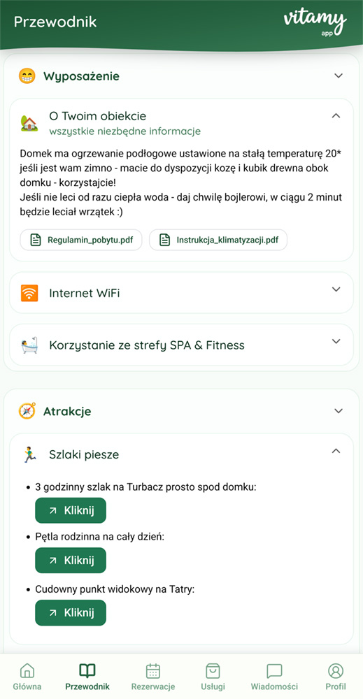 Gość ma dostęp do panelu Twojego obiektu przed przyjazdem, może zapoznać się z przewodnikiem po okolicy. Bez instalacji, bez tworzenia konta - zero problemów dla gości